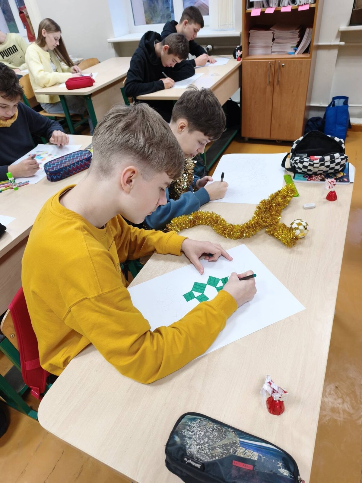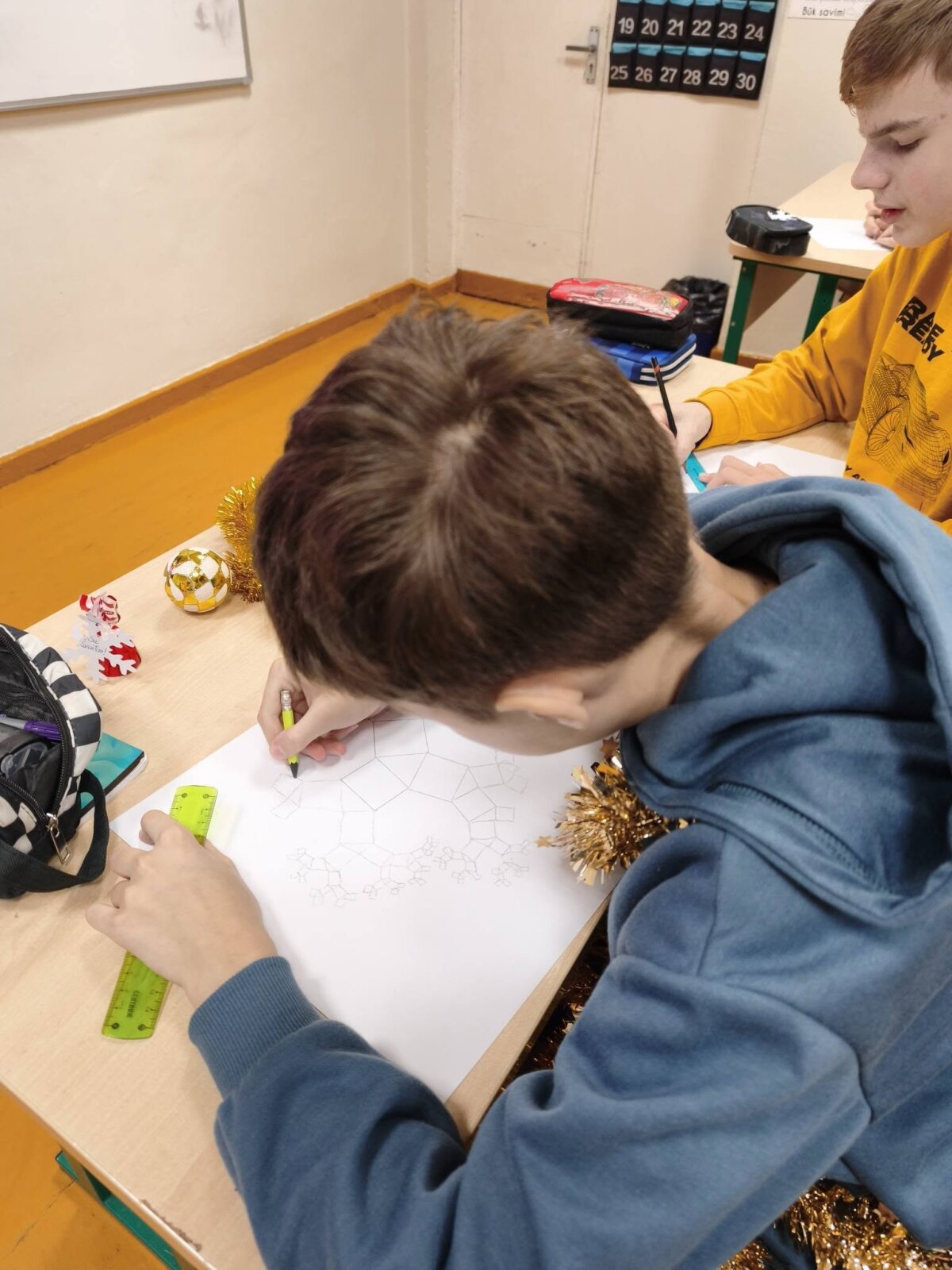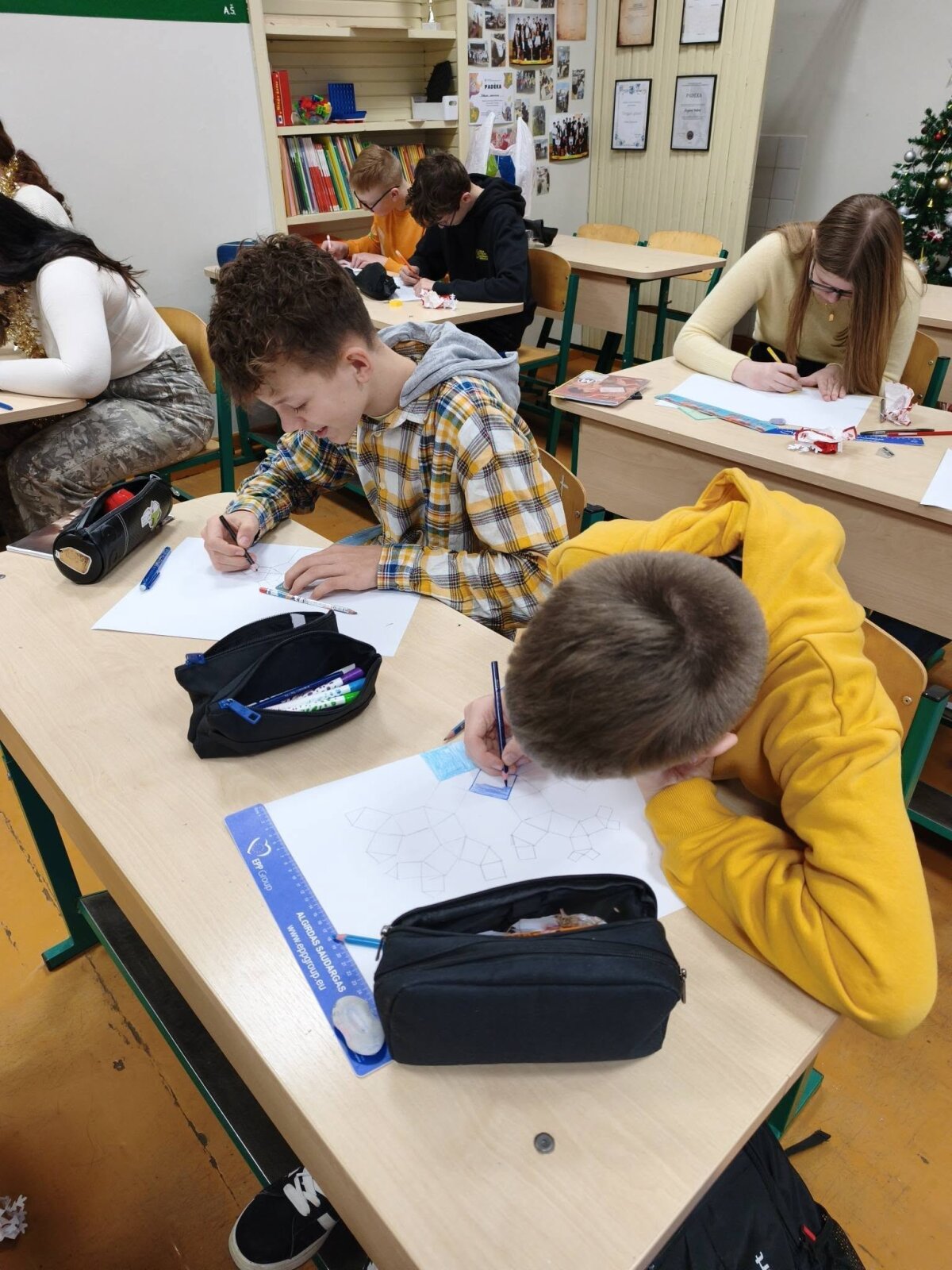 8 klasės mokiniai kalėdinėje matematikos pamokoje pasinėrė į STEAM veiklą „Pitagoro medis“, kurioje susijungė matematika ir kūryba.