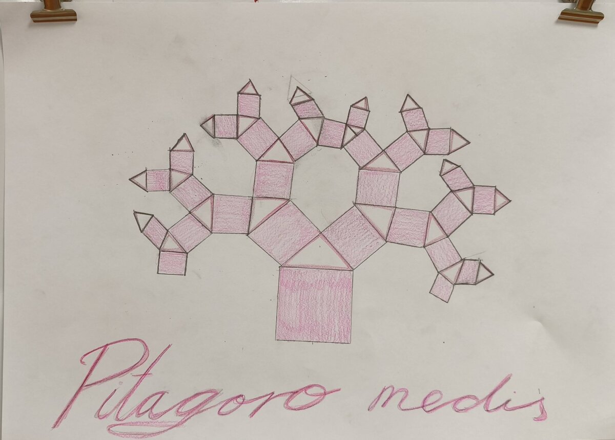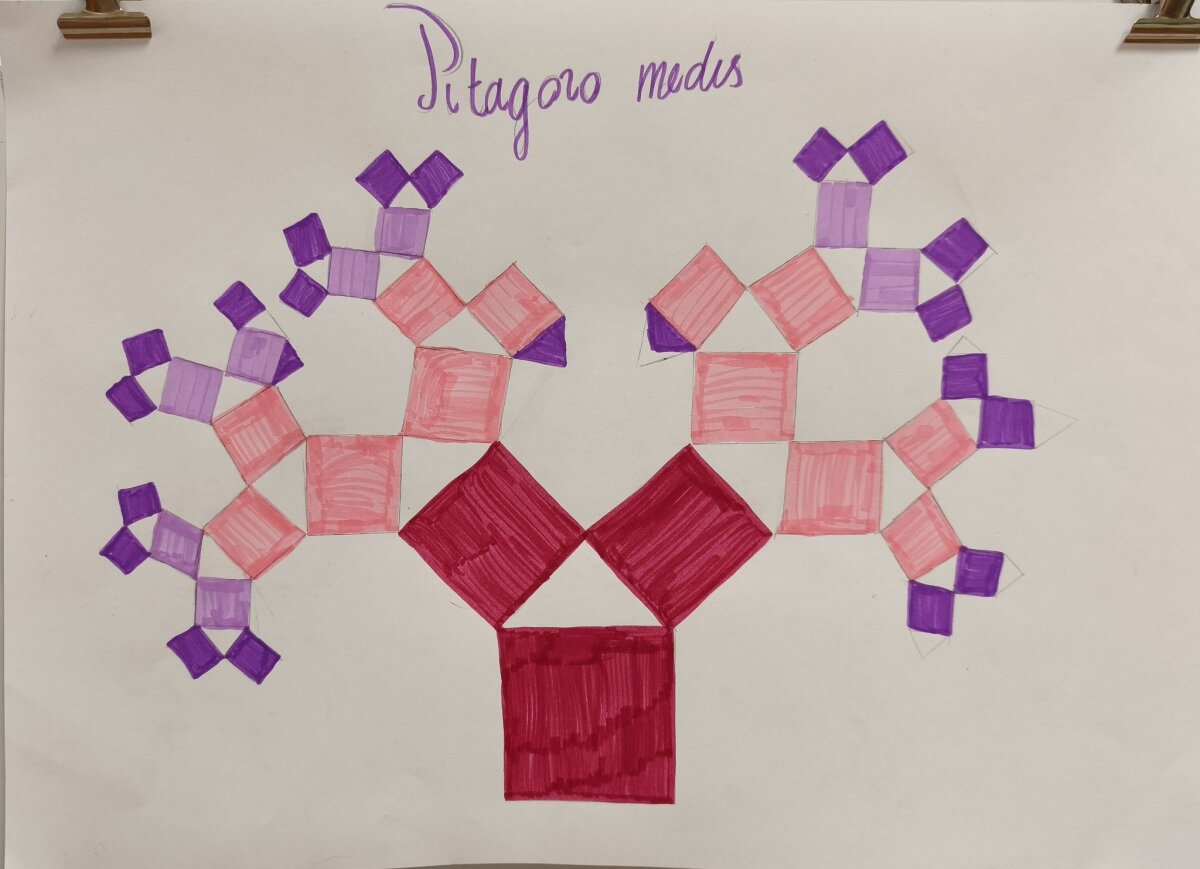 Remdamiesi Pitagoro teorema, mokiniai konstravo medį iš kvadratų, stebėjo, kaip iš skaičiavimų, braižymų gimsta vizualiai įspūdingas, šventiškai atrodantis kūrinys. Kiekvienas darbas buvo unikalus – skyrėsi proporcijomis, spalvomis ir sprendimais.