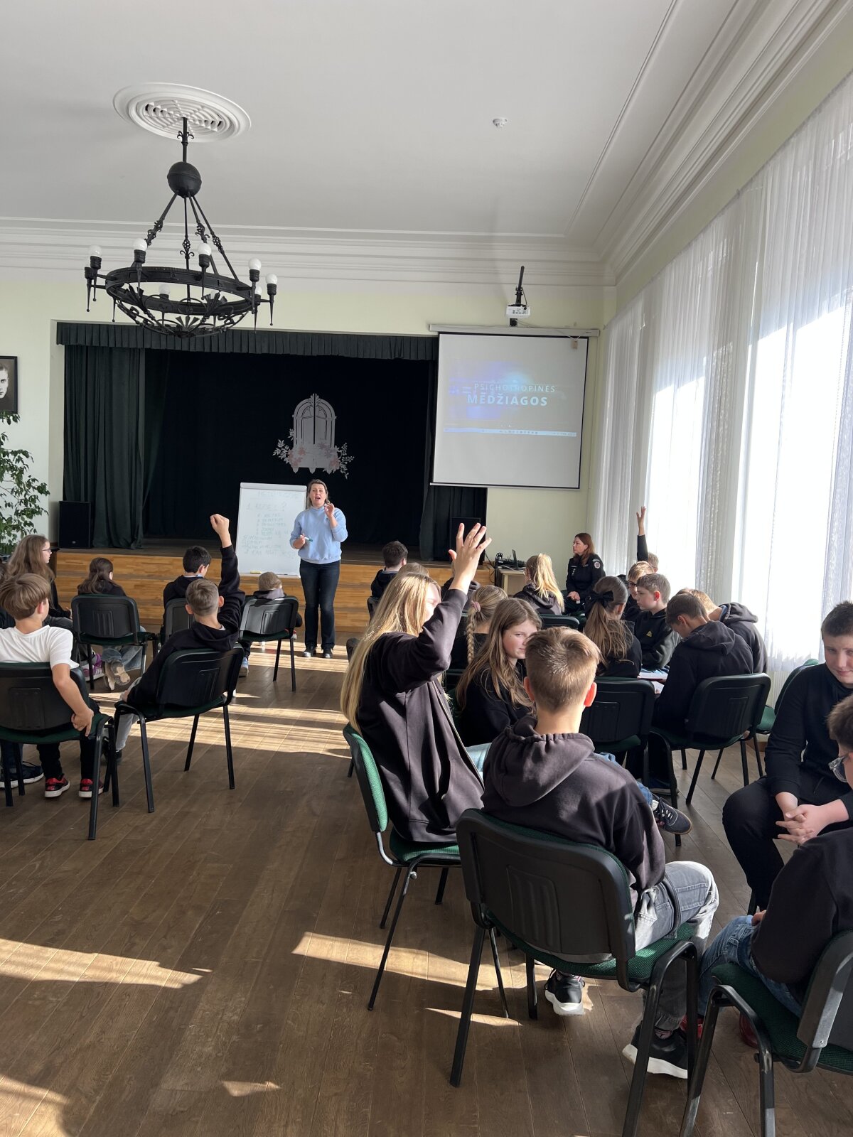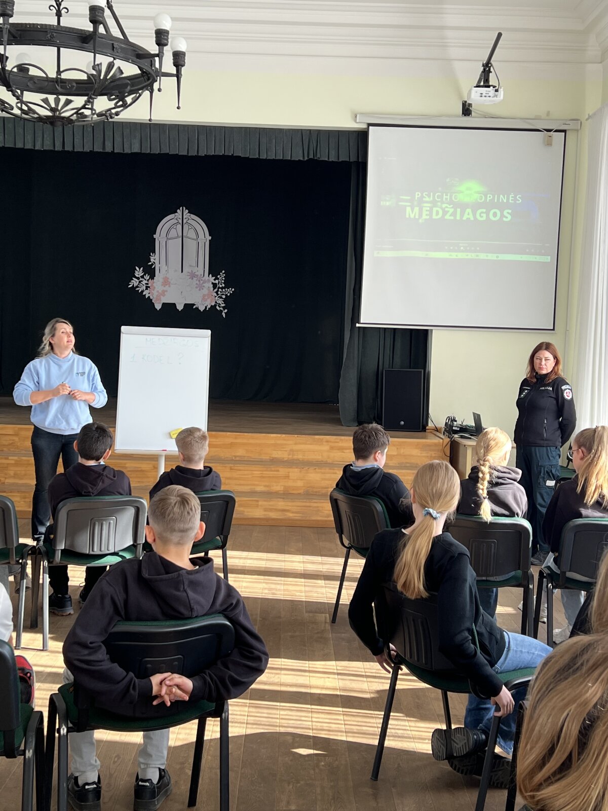 Tęsiant prevencinį projektą „Mokykla be dūmų“, 7 klasių mokiniams vyko aktuali ir įtraukianti paskaita „Psichoaktyvių medžiagų žala sveikatai ir teisinė atsakomybė“. Užsiėmimą vedė visuomenės sveikatos priežiūros specialistė Martyna Malinauskienė ir bendruomenės pareigūnė Audronė Jurdonaitė, kurios su mokiniais kalbėjosi apie psichoaktyvių medžiagų vartojimo pavojus, atsakomybę ir sveikatos išsaugojimo svarbą.