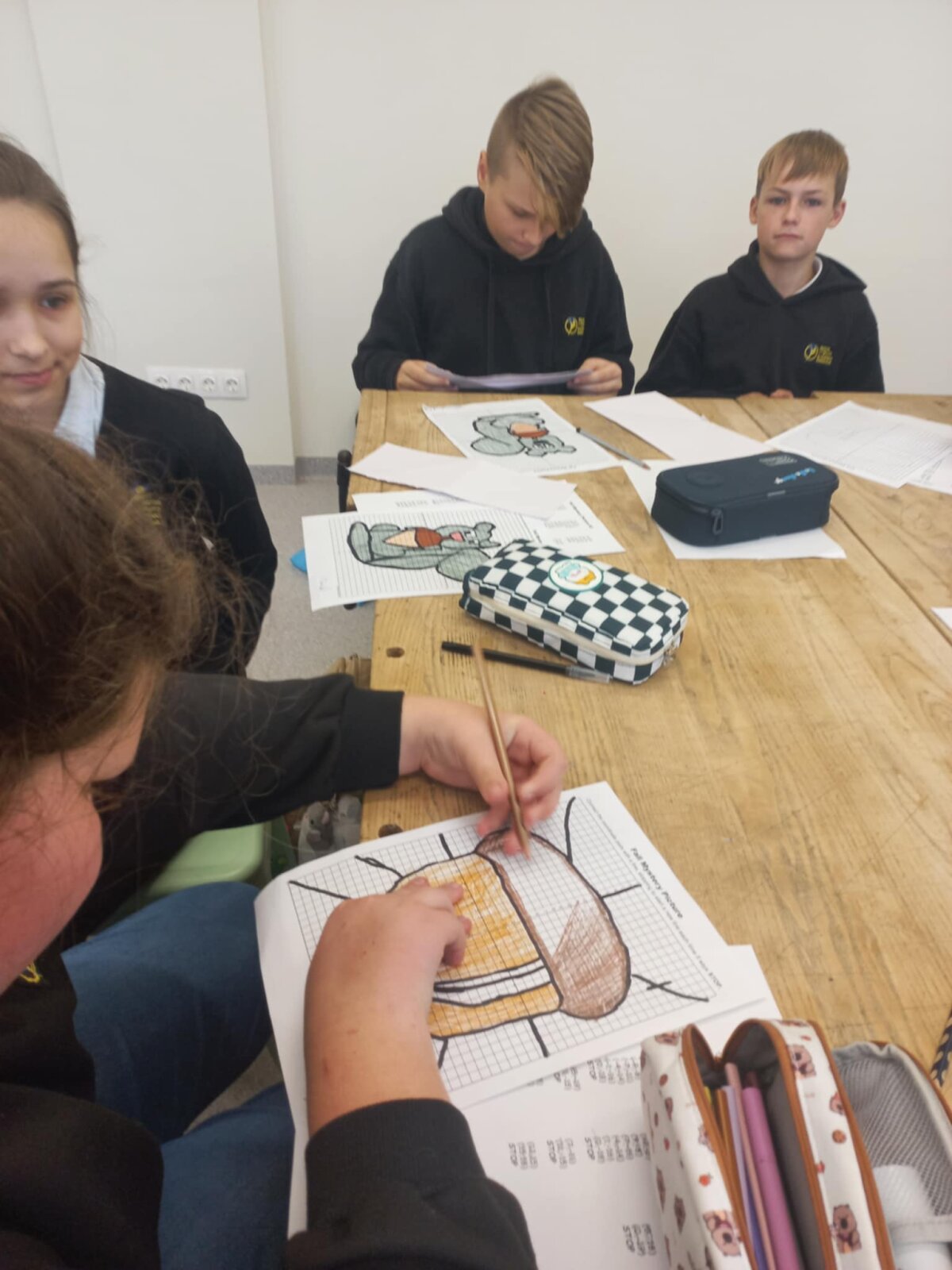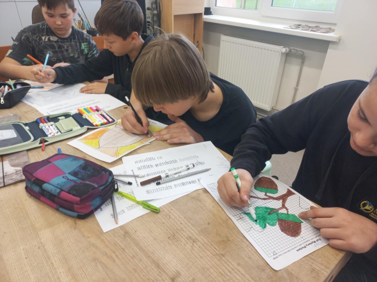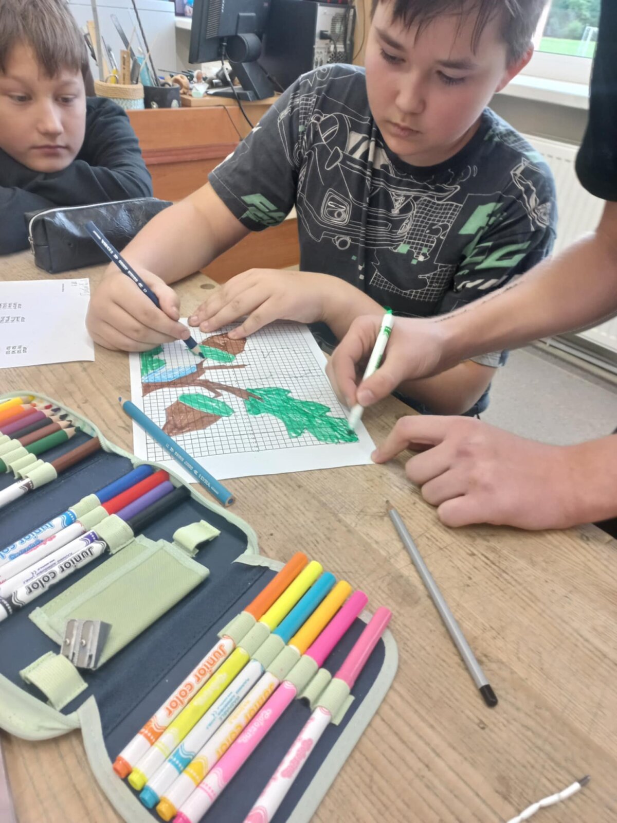 Mokiniai, kruopščiai žymėdami taškus ir jungdami juos pagal koordinates, atskleidė paslėptus piešinius. O tada – įsijungė dailininko fantazija: spalvos, detalės, fonai... Ir paprasti taškai virto unikaliais meno kūriniais!