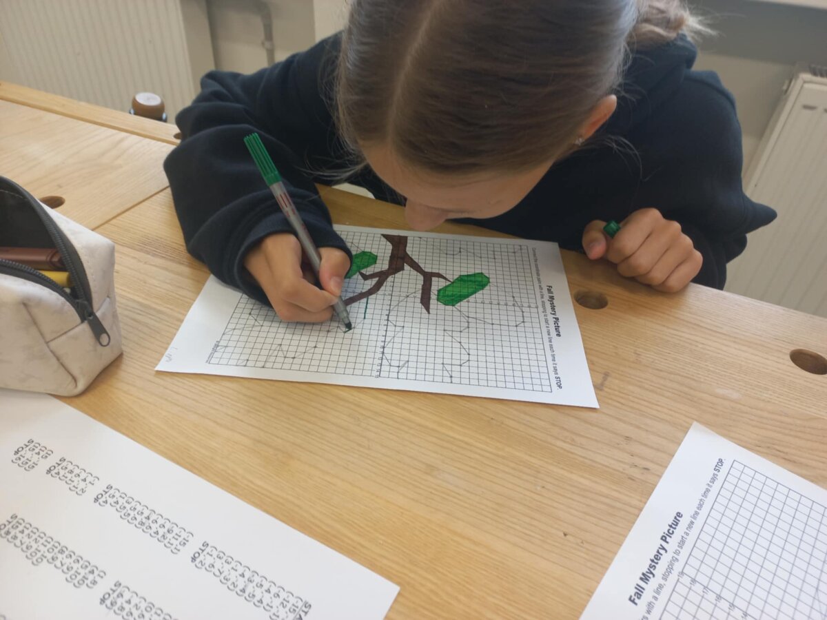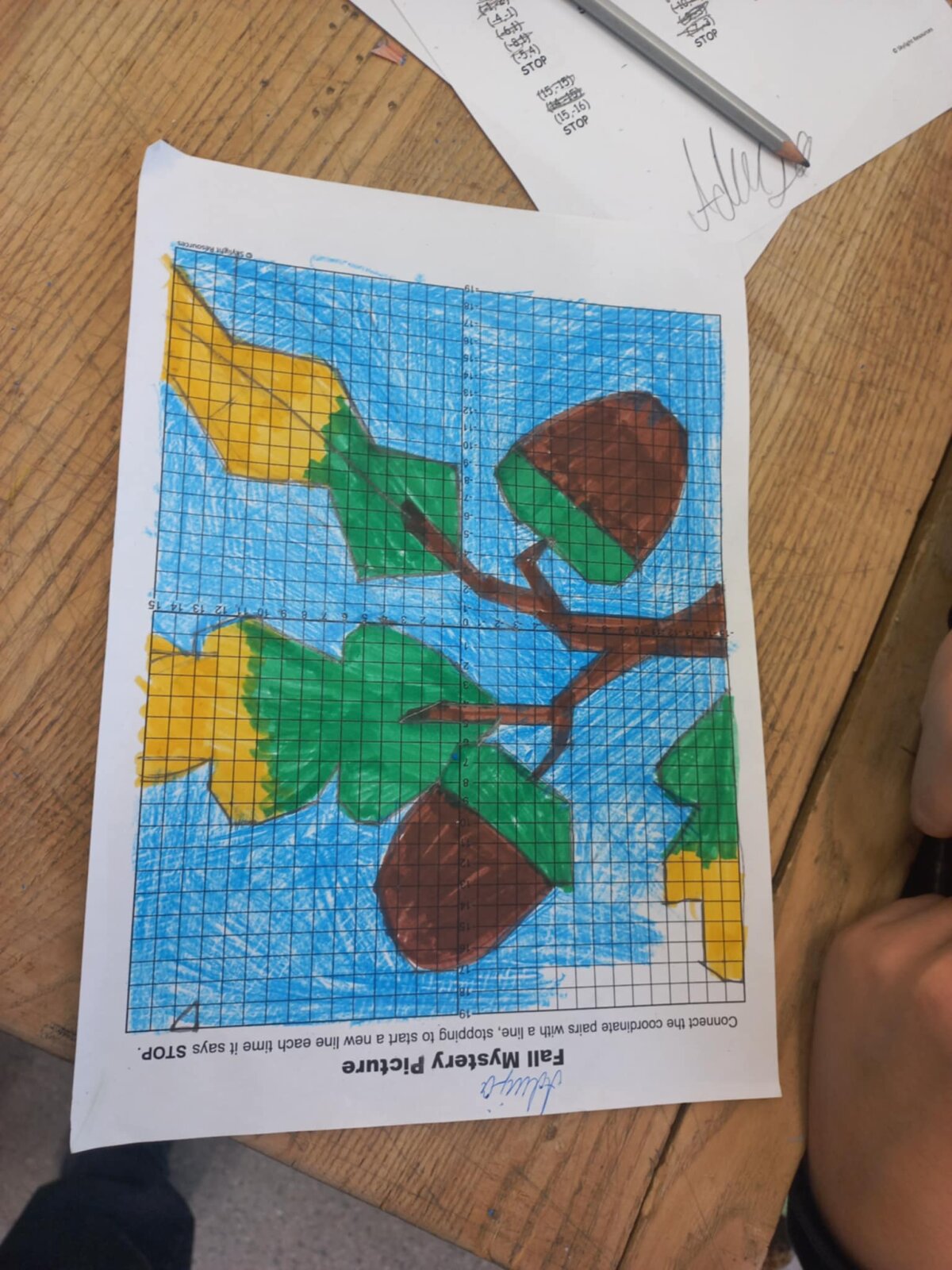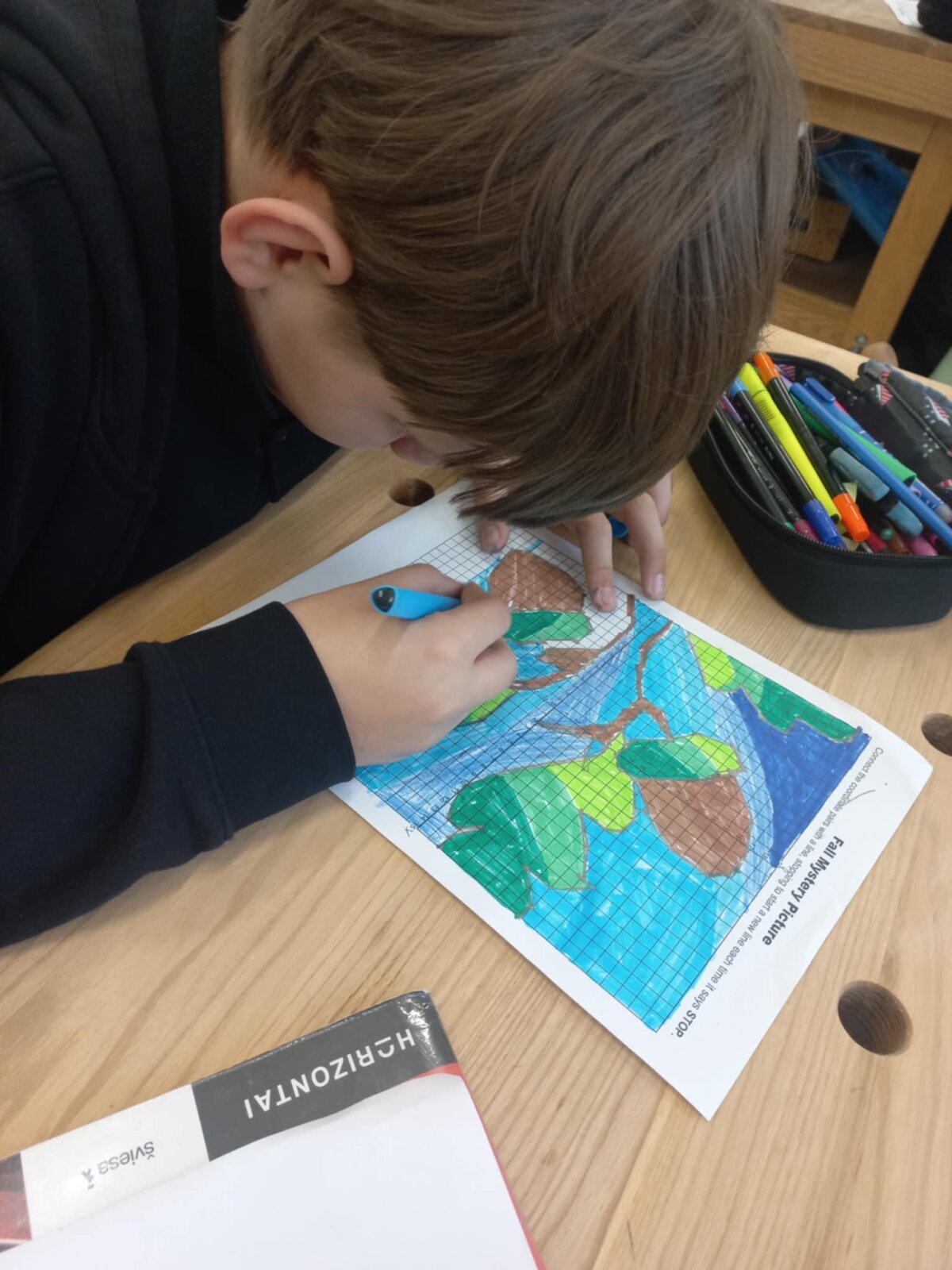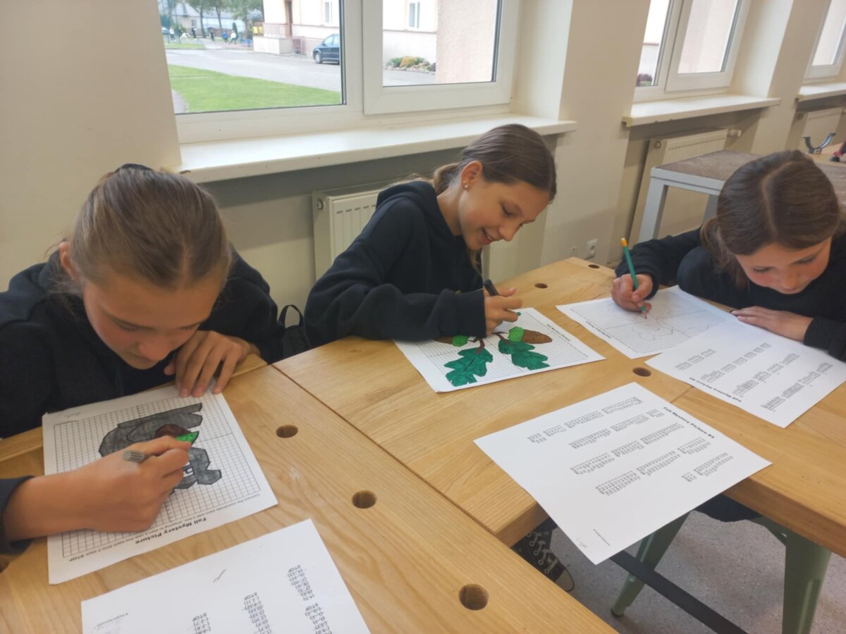Mokiniai, kruopščiai žymėdami taškus ir jungdami juos pagal koordinates, atskleidė paslėptus piešinius. O tada – įsijungė dailininko fantazija: spalvos, detalės, fonai... Ir paprasti taškai virto unikaliais meno kūriniais!